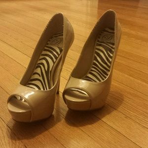 Nude Peep-toe platform heels. Heel is 5 1/4 in high and platform is 1 inch high. Well taken care of hardly used them no scratches.
