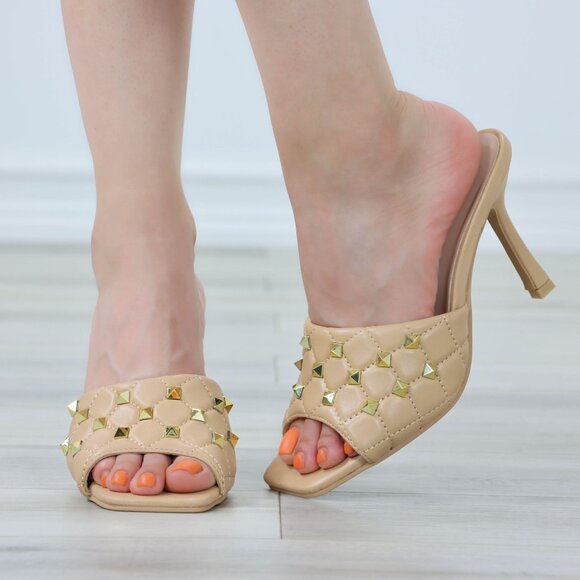 Nude High Heel Sandals Square Open Toe Slip On Mules Stiletto's
