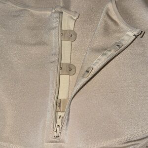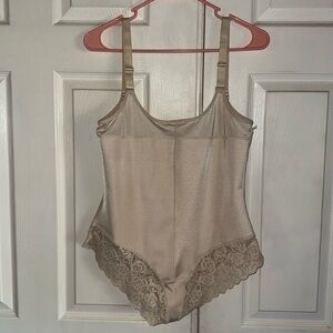 Nude lace trim shapewear. Adjustable shoulder straps. Hook and eye with zipper closure. Hook and eye crotch closure. Size 3XL. 18 1/4” armpit to armpit laid flat. 17” across hips.