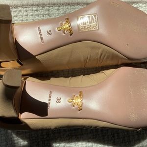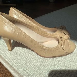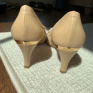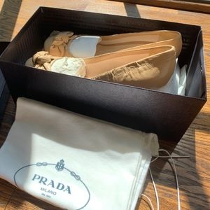 Beautiful classic pair of barely worn Prada Calzature Donna Antic Soft 3 heels with bow in tan/nude sabbia color. Elegant gold band with Prada engraving on back of shoe (see pictures). In original box with packing materials and felt Prada shoe storage bags. Hardly any wear on soles/heels.
