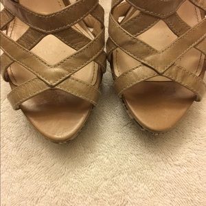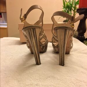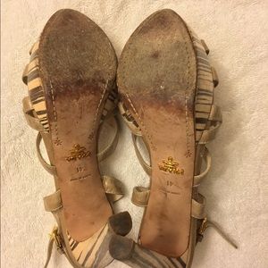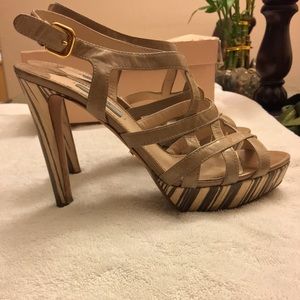 Gently loved nude Prada platform strappy heels. Leather upper. Super comfortable, 4.5" heel. I also have the box but it is damaged (top is torn on the side) but can send it if you want it.) purchased at Barney's New York