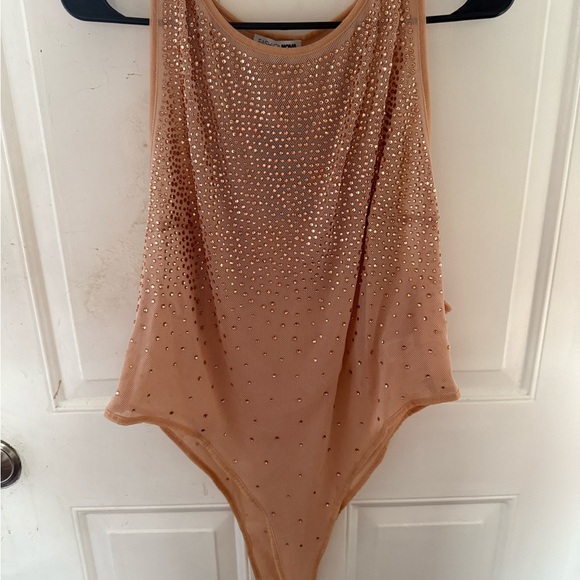 Elegant nude bodysuit adorned with sparkling rhinestones. Perfect for a night out or special occasion. Sleeveless design with a scoop neckline.