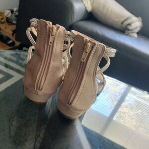 Bought sandals to wear for a wedding weekend and no longer have a need for them. Looking to sell. Peachy nude color, rhinestones are white. zipper in the back. very comfortable, see pictures for signs of wear and where rhinestone may have fallen off. From a smoke and pet free home.