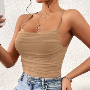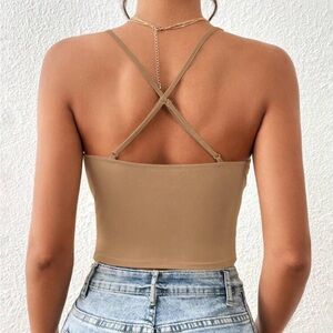 Elevate your wardrobe with this trendy nude crop top, featuring a flattering ruched front and cross-back adjustable straps for a secure and stylish fit. This top is new without tags and has never been worn, making it perfect for casual outings, layering, or pairing with high-waisted jeans or skirts.