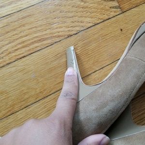 Open toe nude/taupe/tan Calvin Klein heels. They look great with any outfit. Please see photos for wear & tear.