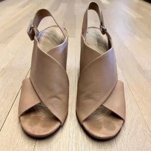 Nude heeled sandals from Vince. Velcro ankle strap.