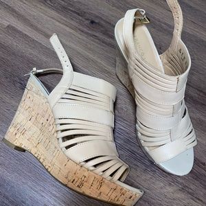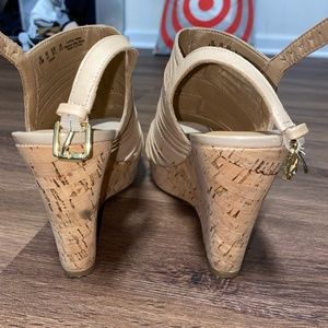 These Franco Sarto Nude wedges are a size 9, and in pretty good shape. They have been lightly worn, maybe 2 or 3 times years ago. They are super cute and comfortable.
