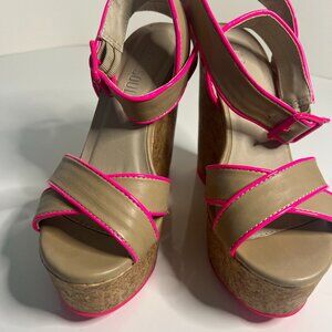 Sandals in great used condition, fun neon pink piping on nude color. Cork platform wedge heel, it measures 5.5"