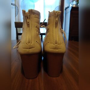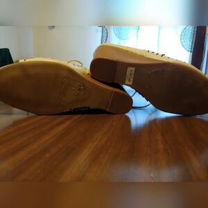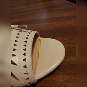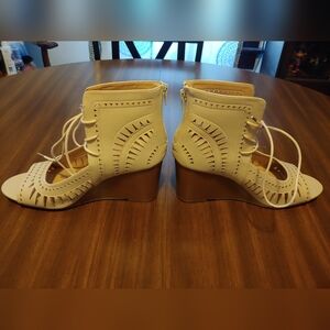 Torrid nude geo patterned wedge shoe. Size 10w. Plenty of string to use to tie them. Some glue showing but does not compromise the shoe. Some sticker residue on bottom of soles. Normal wear and tear on the soles. No rips. No tears.