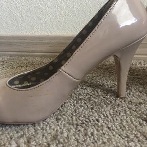Modest nude heels. Some scratches (on inside right shoe, photo 2) and dents in heels. Brand fergalicious.