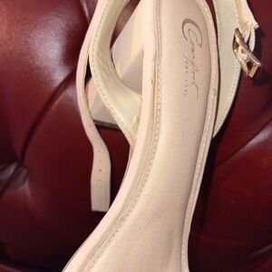 Nude ankle-strap block heel sandal with a minimalist single toe band. Features a secure buckle closure and a comfortable padded footbed. Versatile nude color pairs easily with many outfits for day or night wear. The heels have a couple of tears but are in good condition still .