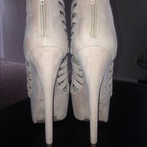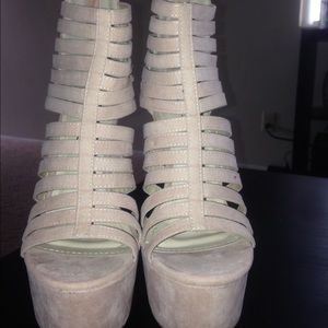 Very comfortable, suede nude heels are great for any occasion. These scrappy, flirty heels can compliment any outfit in your closet while Only worn once. 5 inch heel. They are a size 6.5 but I usually wear a 7 and they fit me perfectly. They are in perfect condition.
