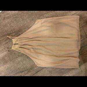 Nude, 100% polyester blouse with dainty gold button at neck.