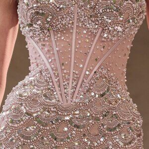 Designed to captivate with intricate detail, this fitted gown showcases a strapless sweetheart neckline and an illusion corset bodice that sculpts the waistline. The fully beaded overlay features a dazzling art deco pattern crafted from pearls and sequins, adding dimension and movement to the entire silhouette. This glamorous style is a stunning choice for prom, gala, or any high-fashion formal event.