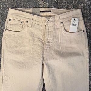 This pair of Nudie Jeans (“Lean Dean”) in Ecru Twill is in new condition (New With Tags, yet not the ‘price tag’); never worn. Men’s size: W32 L34; its color is Ecru Twill.