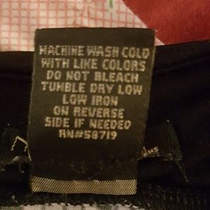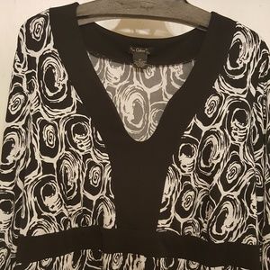 Nue Options Plus Size 3X Tunic. Black & white swirl/abstract roses print. 3/4 sleeve. 4" slits at side seam hem. Solid black banded neckline, sleeve, hem, empire waist. 48" circumference at empire waist; shoulder to hem 27". 96% polyester/6% spandex.
