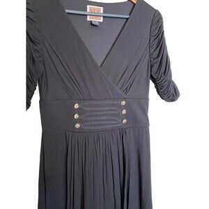NUE by Shani Dress Size 6 Black Ruched 3/4 Sleeves Buttons Pleating Crossover Bodice