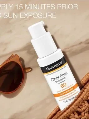 Broad spectrum SPF 70 face, Neutrogena Clear Face Serum Sunscreen with Green Tea, and Neutrogena Ultra Sheer Liquid Mineral Sunscreen.