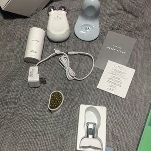 Nuface trinity with wrinkle reducer attachment and with effective lip and eye attachment as well as 1.69 fluid ounces of hydrating aqua gel. Used a couple times and just don't have enough time in my routine for it. was able to get new aqua gel and everything come in its original box