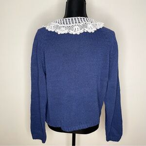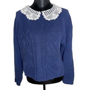 Nuggets Cable Knit Sweater Ivory Crochet Collar Blue Size Large