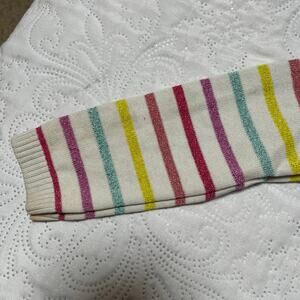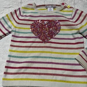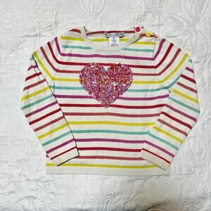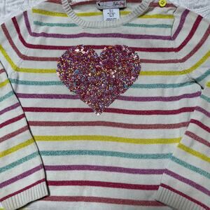 Nula Bug pullover knit sweater. Multi color stripes with sequin heart appliqué design. Good condition, some light wear and dinginess on sleeve. Size 5.