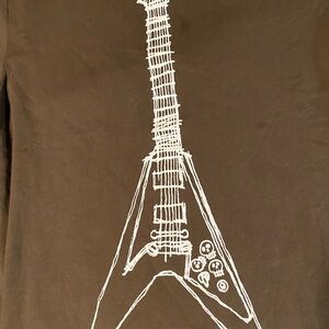 Brown t-shirt featuring a white guitar graphic. Casual and stylish.
