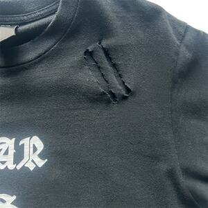 From Takahiro Miyashita’s politically charged AW04 collection “Give Peace a Chance”. The collection was a response to post-9/11 global unrest and Western military intervention—channeling protest energy through punk designs. This particular piece features the confrontational “War Is Terrorism Too” slogan in distressed Old English font.