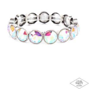 Faceted iridescent gems are pressed into sleek silver frames. The glittery frames are threaded along stretchy bands, creating a glamorous look around the wrist.