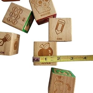 Number picture learning stacking wood blocks. 1,2,3,4,5 on one side, 0,6,7,8,9 on the other. Animals and images , words on the other sides. Please see all pictures for details, blocks have some small dents or scratches but overall in very good play condition. I believe these are feom a vintage set, as my children had the exact ones in the early 90's.
