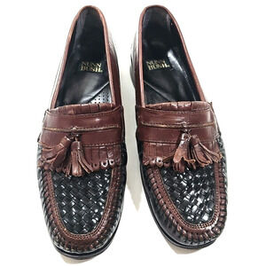 Elevate your style with these Nunn Bush loafers. The sleek black and brown genuine leather upper adds a touch of class, while the weave pattern and tasseled accents give them a modern edge. These dress shoes feature a comfortable leather insole and outsole, making them perfect for any occasion. The slip-on style and round toe shape ensure a easy and comfortable fit, while the shoe width of W provides a perfect fit for those with wider feet. The Nunn Bush loafers are a great addition to any wardrobe, suitable for both formal and casual occasions.