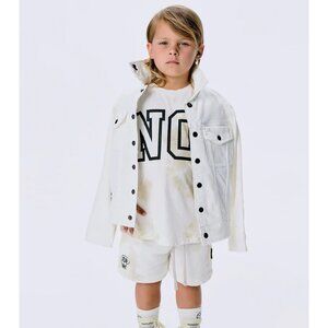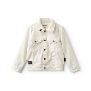 a classic white denim-looking jacket but make it fierce. this one is made of drill so the boy or girl wearing it doesn't feel held back in their range of motion. they always need to be ready to pounce. it's got super rad snap buttons all the way down for pro-level layering & deconstruction on the hemlines to show off their low-key dangerous on the playground lifestyle. it’s got one way in street inspired letters underneath our cool cat print that looks sketched right on the giant patch sewn right to the back. of course, it's imperfect with a rough fringey border because we do what we can to show that this kid plays by their own rules.