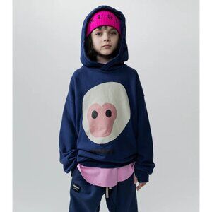 catch the kid wearing this indigo hoodie playing 24/7. that’s because it’s made of totally soft french terry that's as comfy as you’d imagine the fur of the funny little monkey printed on the front. the design looks so rad because it was created in collab with artist shay id alony. oh and peep our nununu logo at the bottom in a print that looks like the monkey’s teeth fell out. of course, it’s got the cool kid thumbholes & custom deconstruction, plus a big old criss cross hoodie with the tag right on the top. we’re absolutely bananas about this fit and we know your kid will be too.