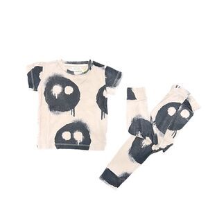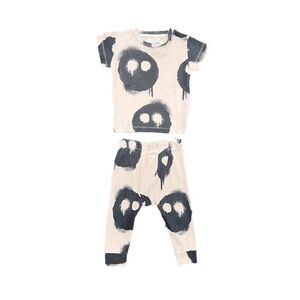 we’re having a bit of a face melt moment, and it shows… our cotton cozy loungewear set have our “melting mask” graphic all over, a highly rebellious take on the smiley face and it comes all over this nude set of short sleeve t shirt & leggings. soft cotton