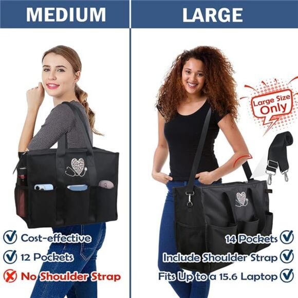 *Abamerica Nurse Bag offers 2 sizes ,each with 12 pockets. Medium for grab-and-go, large with extra capacity, laptop sleeves & detachable strap.