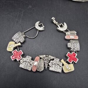 This slide charm bracelet features nurse-themed charms and measures 7.75" L