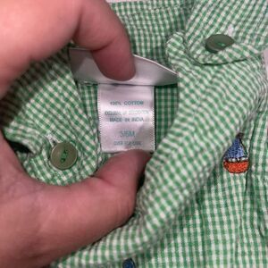 Nursery Rhyme Green & White Gingham Romper w/ Sail & Tug Boats - Sz 3/6 mths