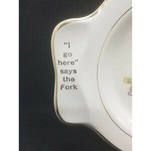 This 1940's child's food dish has transfer design called "The Danish Princess" showing a little girl feeding her teddy bear in a high chair. It's adorable and also shows a child where to place their fork and spoon. Nice, thick gold trim around the outside of the dish as well as the center area. Marked "Made for International Silver Co, US Design Patent 88343, By The Salem China Co."