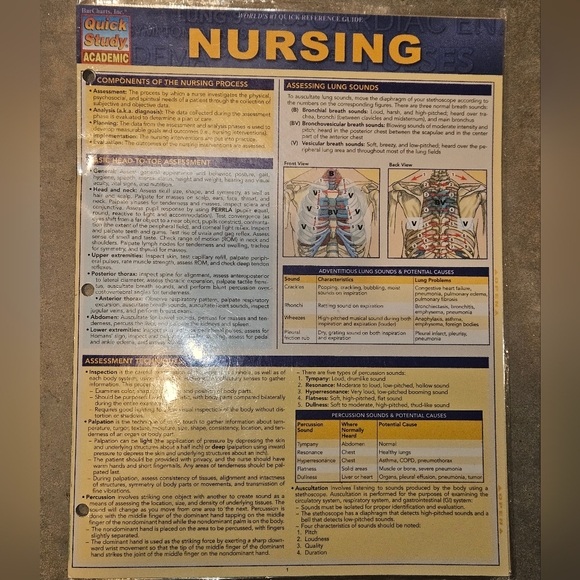 Quick reference guide for nursing. Features detailed information on nursing processes and assessments. Ideal for students and professionals.