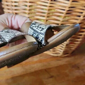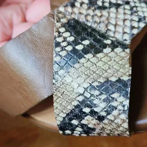 Comfortable, cushioned insole. Soft leather upper with snakeskin accent straps. Textured, rubber soles.