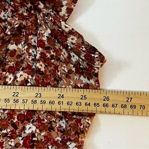 Nurture Dress by Westbound Women. Short Flutter Sleeves, Tie at the Neck. Lined from waist down. Small floral print in Rust, orange, tan and cream. Size 2X