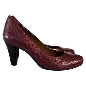 The Nurture by Lamaze Shoes Nurture Copper "Marjorrie" Reptile Print Heels in size 6.5M are stylish and comfortable pumps perfect for various occasions such as weddings, parties, formal events, and even workwear. Featuring a slip-on closure, mid-height block heel, and animal print pattern, these heels are made of leather with a standard shoe width. The maroon color and reptile print add a touch of nature and uniqueness to the design, making them a standout choice for any wardrobe. Perfect for all seasons, these shoes are a versatile and chic addition to any woman's shoe collection.