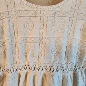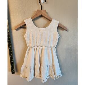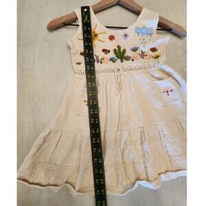 Cream colored girls dress. Knitted. Embroidered Sun, Flowers, animals, cactus on front. 100% Cotton. Hand Wash. There is no size tag. See measurements. Looks to be a 2T. In good preowned condition. Smoke free home.
