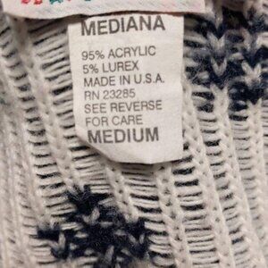 Blue, white, Red & green Christmas Sweater. Blue with white snowflakes and Christmas presents, Teddy bear, with silver buttons