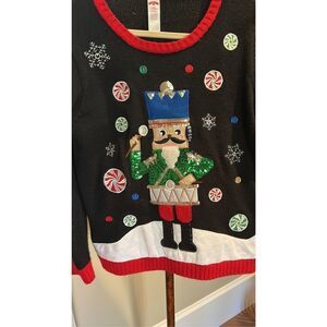 Not an ugly Christmas sweater. Cute Appliqué and Sequined nutcracker on the front of this cute Christmas sweater in good used condition. Pit measures 22 inches.
