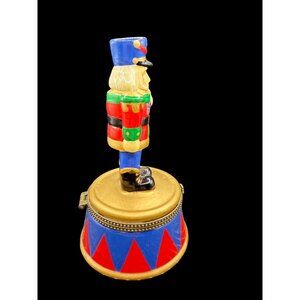 Nutcracker Hinged Trinket Box Ceramic Collectible Toy Soldier on Drum. This hand-painted Nutcracker music box is a charming decorative piece. Featuring vibrant colors and intricate details, it adds a festive touch to any holiday decor.
