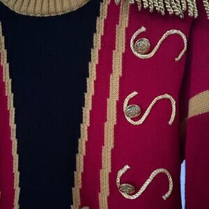 - Design: Nutcracker / gold rope fringe, gold-tone buttons, ribbed cuffs/collar/hem, front pocket / glittery metallic thread around faux buckle