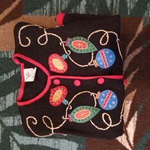 Celebrate the season with this charming black sweater featuring a vibrant ornament design. Perfect for adding a festive touch to your wardrobe. it has surface stain on the back that will come out at washed...measurements are in the listing...women's small
