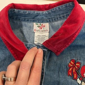 Shows some light discoloration or sun bleach, velvet collar and cute embroidery!