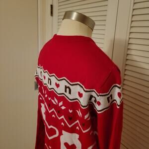 fun holiday sweater, Nutella Christmas sweater, unisex ugly sweater, official Nutella merch, novelty food sweater, cozy winter pullover, medium red sweater, heart pattern jumper, retro holiday party wear, foodie fashion, festive knitwear, quirky Christmas gift, collector’s apparel, winter wardrobe, playful graphic sweater, holiday season style, cheerful red pullover, unique holiday clothing