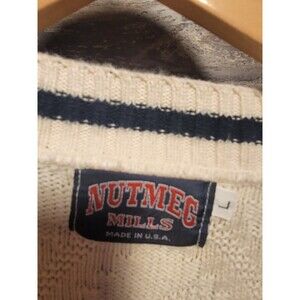 The Nutmeg Mills United State Marines Classic Collection Vintage Sweater in size L is a sportswear/beach look sweater from the 1990s, made in the United States. The sweater is a classic piece with a clean white color, perfect for adding a touch of vintage charm to any outfit. Made from high-quality materials, this sweater is a timeless piece that pays homage to the United States Marines.